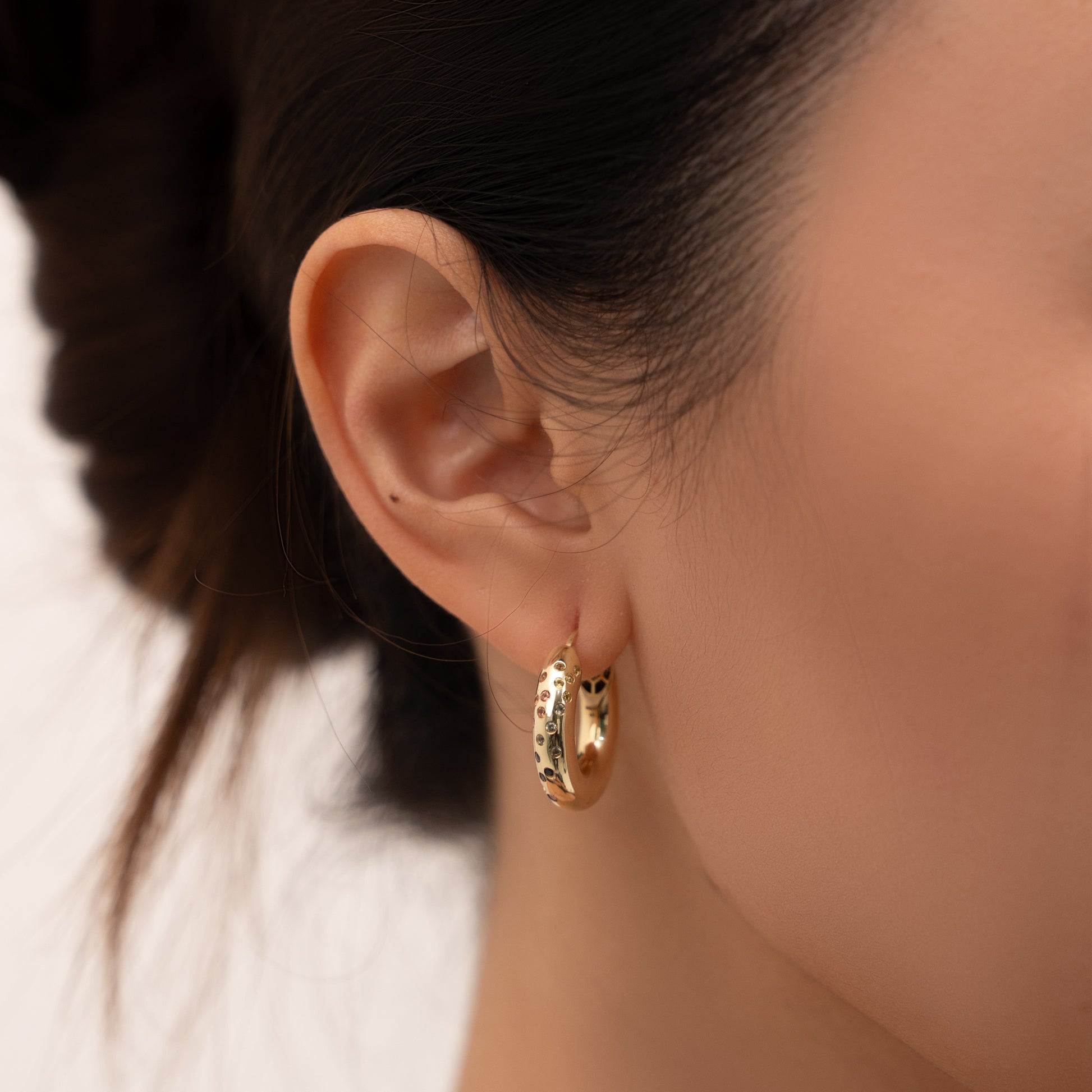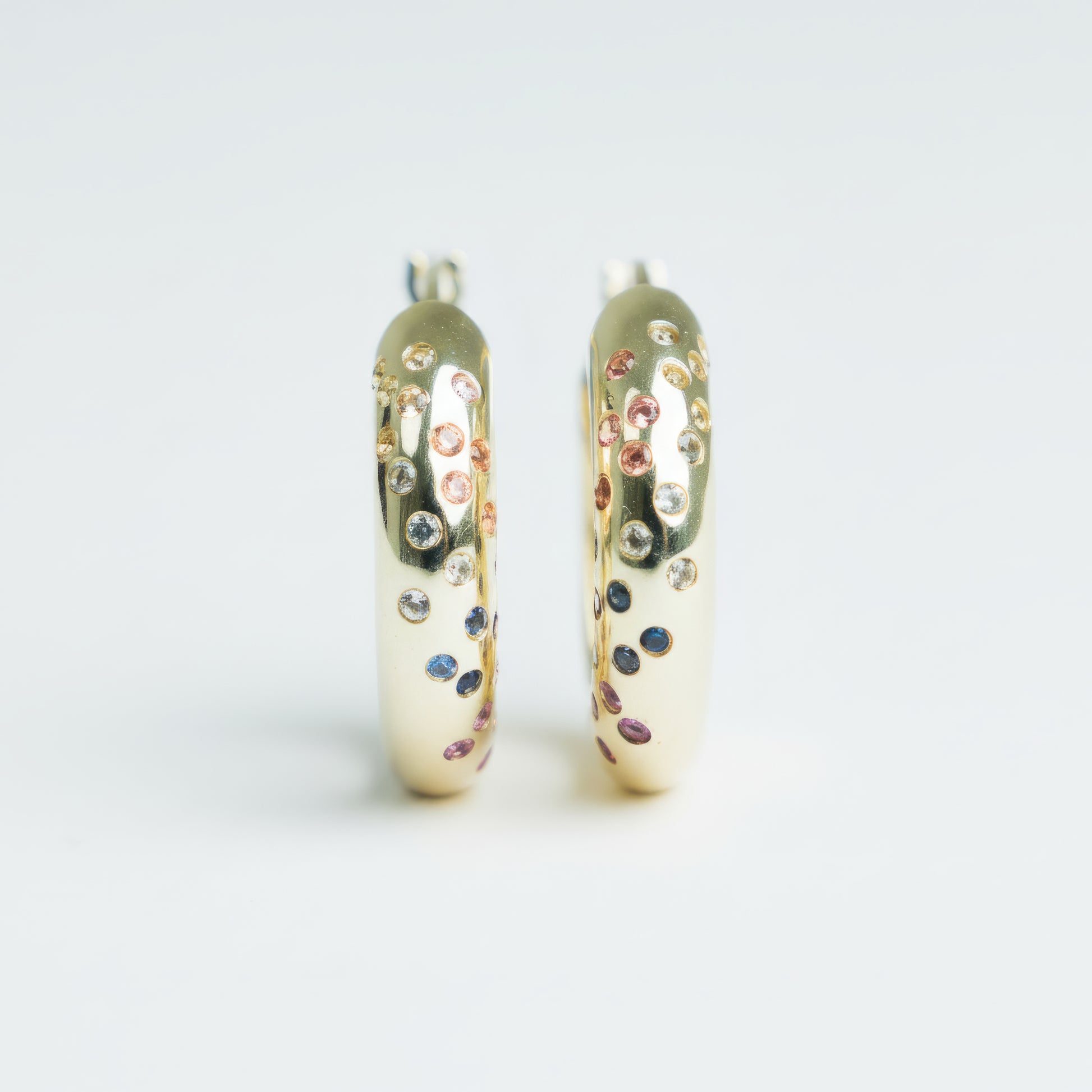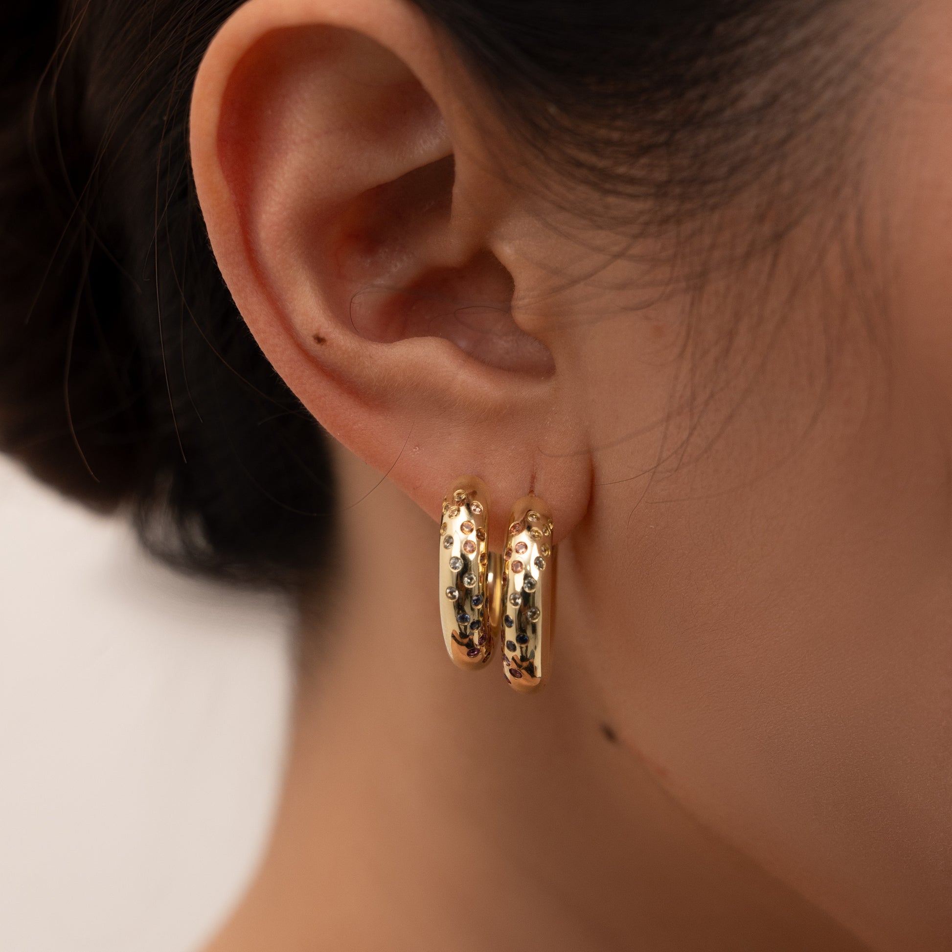 Set in solid 9k gold and finished by hand, these huggies are accented with carefully selected sapphires for a soft, luminous effect.