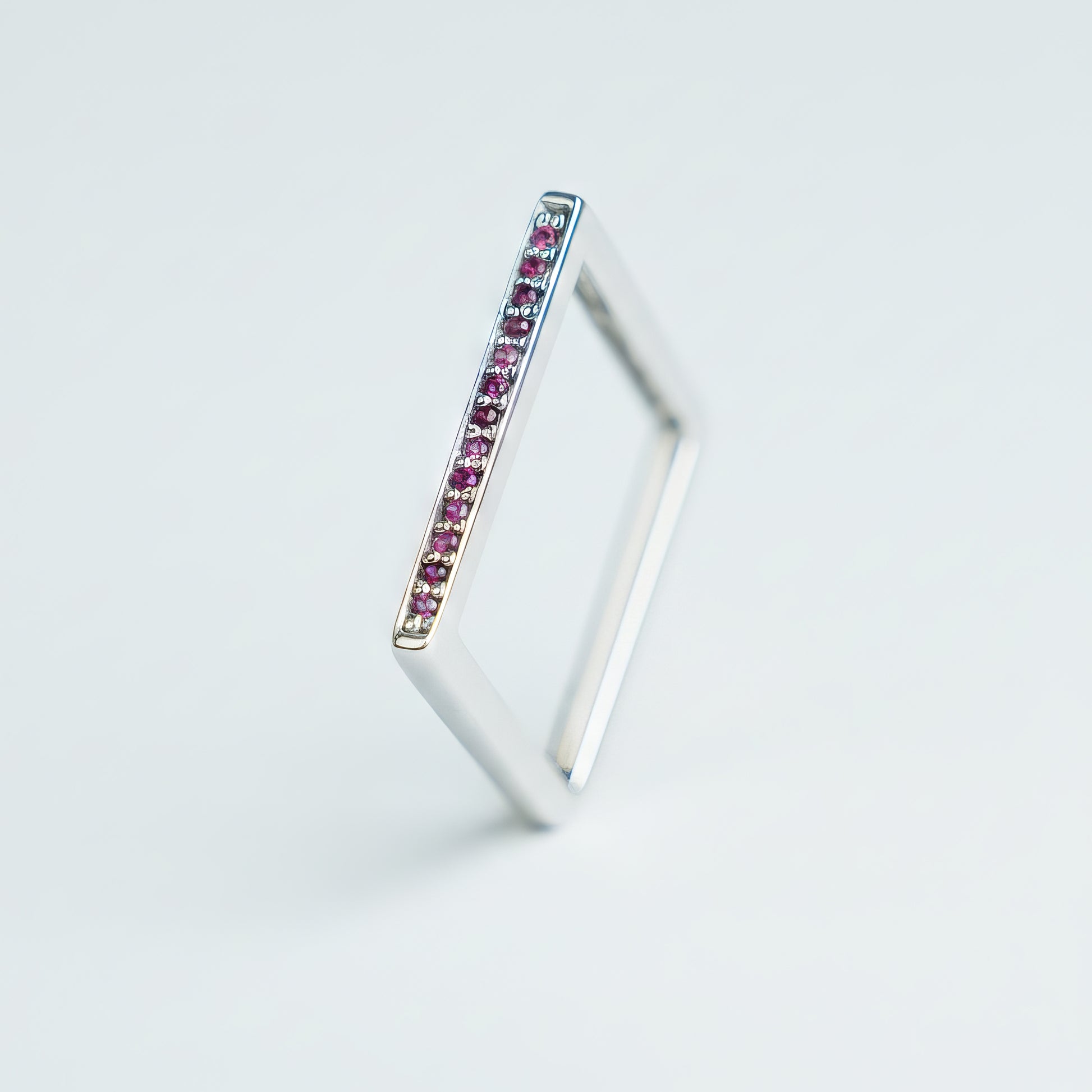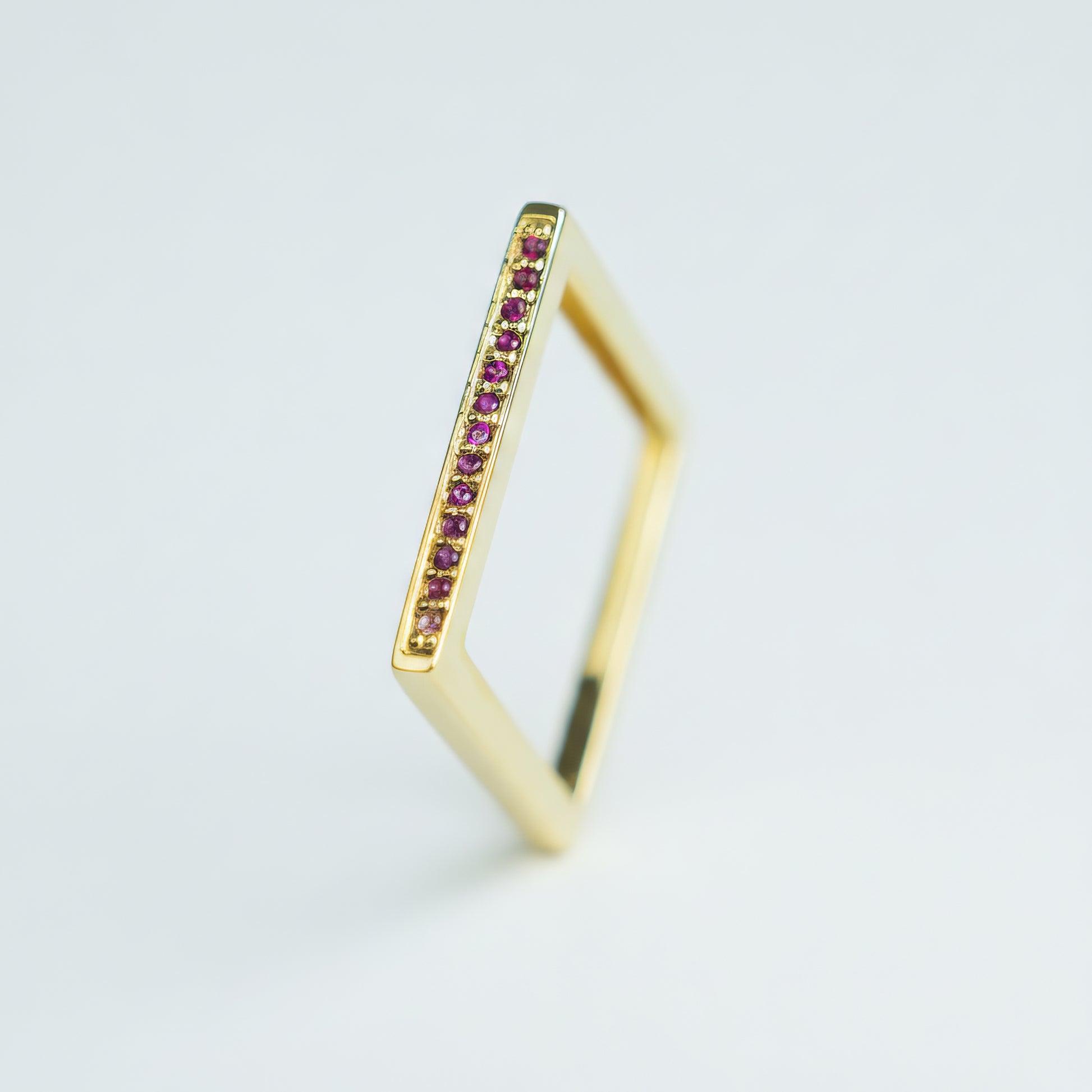 The pink sapphire is set into a solid 14k gold square frame, allowing its softness to shine without losing definition.